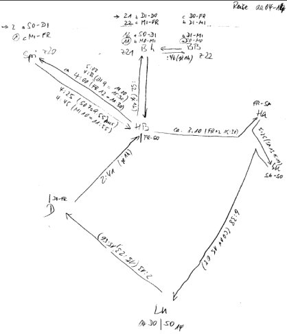 So sieht Joachims Vorbereitung für die Zugverbindungen der nächsten elf Tage aus, das hat er als Mathematiker geschrieben, und ich brauche lange, bis ich das alles verstanden und in meinen Kalender übertragen habe.
