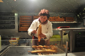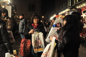 Das 175-jährige Bahnjubiläum wird im Puppen- & Spielzeug-Museum begangen mit einer großen Märklin-Eisenbahnanlage, Frau Haupt gibt uns ein Interview zur Eisenbahn-Ausstellung und zum Rothenburg-Tourismus. Wir gehen über den rund um das Rathaus angesiedelten Weihnachtsmarkt, aufgeräumt und niveauvoll, und heute nicht besonders voll. Das Gedränge finden wir im warmen Durchgang beim fränkischen weißen Glühwein, auf Wunsch mit Schuss und in der Nachfüllung billiger. Ein Ausweichen dieser vorweihnachtlichen Aktionen ist im Ortszentrum unmöglich, dazu gibt es Dauerweihnachtseinkauf bei Käthe Wohlfahrt, erleichtert durch dirndlbekleidete Verkäuferinnen. Der Konsumbetrieb ist hier perfekt, professionell,