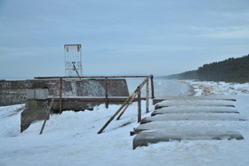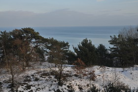 Marlis hat sich leider eine hoffentlich leichte Erkältung eingefangen, so geht der erste Gang in die Apotheke. Dafür sind wir etwas früher unterwegs. Heute kommt ein Ort, der uns interessiert: die KdF-Bauten von Prora, die von Binz per Strandwanderung zu Fuß zu erreichen sind. Außerdem gibts dabei ordentlich frische Luft. Das Wetter ist natürlich kein Vergleich zu gestern: auf den Straßen und Wegen hat es getaut, besonders, wenn Salz im Spiel ist. Die weiche Schneeschicht von gestern ist durch den Regen komplett verschwunden, dafür tritt an vielen Stellen Eis zutage. Die Strandwanderung ist heute eher grau, der Sand hart mit Eis überzogen, am Wasserrand sind Muschelstücke eingelagert. Nur am Wassersaum, wo zwischen den Eisschollen Schnee und Eis verharscht sind, lässt sich rutschfrei gehen. Nur Marlis kann die “Autobahn” benutzen: ihr gehört mit ihren Schuhspikes der ganze Strand, und sie kann beim Laufen in die Luft gucken. Nach einer Stunde biegen wir in die Düne ab und durchqueren den Kiefernstreifen. Wir kommen genau am südlichen Ende von Prora an, hinter uns das wohl aus den drei Jahren Bundeswehr-Präsenz übrig gebliebene “Bundeswehr Sozialwerk” mit Campingplatz.