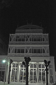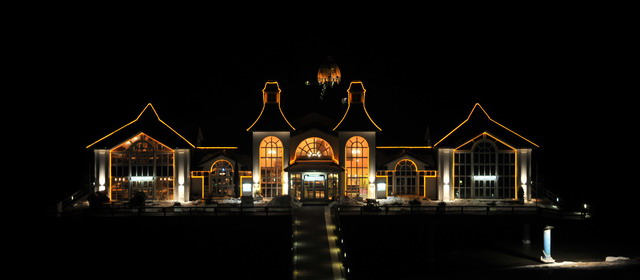 In der Dunkelheit stapfen wir dann zur Hauptstraße und fahren mit dem Bus nach Sellin. Dort gehen wir die fast ausgestorbene Prachtstraße Wilhelmstraße entlang, bergauf gesäumt von vielen großen Villen. Auf dem Weg merken wir uns ein Restaurant. Am Ende der Straße blicken wir von der Steilküste hinunter auf den Strand und die romantisch beleuchtete Seebrücke, auf der gleich am Anfang mit einem Restaurant im Bäderstil steht. An der Spitze ist mittlerweile eine Tauchglocke für Touristen installiert. Die Seebrücke in Sellin haben uns die Ideengeber Horst und Martina mit auf den Weg gegeben, allerdings bei Sonne im Sommer – da ist sie weiß, hell und unbeleuchtet.