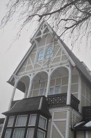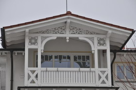 Villen mit verzierten Veranden und Balkonen in verschiedenen Farben. Wir fahren mit dem nächsten