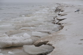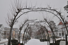 “Boulevard” mit Laubengang auf dem Mittelstreifen zum Strand. Die Bäderarchitektur links und rechts ist, wenn überhaupt, sehr klein und eher nachgemacht geraten, und eine Seebrücke gibt es auch nicht. Es ist ein ruhiges Seebad, das versucht, mit den bekannten Nachbarn Sellin, Göhren und Binz zu konkurrieren. Im Sommer fährt sogar die obligatorische Ortsbahn. Jetzt ist allerdings alles wie ausgestorben. Wir wandern die vier Kilometer Strand bis zur Seebrücke Göhren. Es ist neblig mit vielleicht 300 m Sicht. Der Strand ist noch mit einer glatten Eisschicht bedeckt, nur an der Wasserkante kommt schon Sand hervor und wird matschig, die
