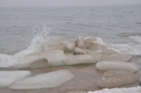 Eisschollen tanzen im Wasser und haben sich mancherorts bizarr getürmt. Am Dünensaum gibt es auch schon einen aufgetauten schmalen Streifen, auf dem man im matschigen Sand laufen kann. Ich habe heute auch meine Spikes mitgenommen, so dass wir die einzigen sind, die über den Eisstrand wandern, als sei nichts. Macht ungemein Spaß! In Göhren laufen wir bis an den