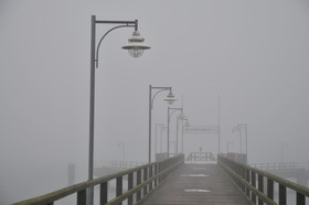 Kopf der Seebrücke. Der Strand versinkt im Nebel. Zum Ort geht es etliche Treppen steil bergauf, Göhren liegt auf einer 50m hohen Landzunge. Spektakulärer Bäderstil ist hier nicht mehr zu finden, dafür einige Fachwerkhäuser und hölzerne