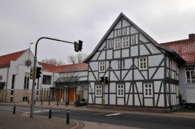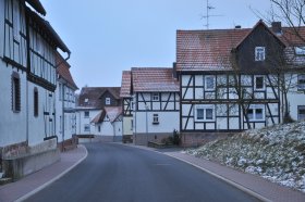 des Mohr’schen Hofs, wo Hermann früher dem Kartoffeldämpfen beigewohnt hat. Es ist ein komplett modernisiertes Fachwerkhaus mit einer Zahnarztpraxis. Der Rest des Hofes ist dem neuen Bürgerhaus gewichen. Gegenüber in der Ortsmitte liegt der Gasthof “Zum Adler” mit Metzgerei. Die Öffnungszeiten passen; den werden wir heute abend heimsuchen. Entlang dem Suhlbach geht es weiter durch den Ort. So langsam merken wir, dass es doch gewisse stilistische Gemeinsamkeiten im Ort gibt. Ausgehend von den locker stehenden Häusern wie sie ursprünglich gebaut wurden, wurde weiter renoviert, und man bezog sich dabei gerne auf die Ideen der Nachbarn. Am westlichen Ortsrand treffen wir auf das Gebiet mit der ganzen Infrastruktur: die alte, mittlerweile deutlich modernisierte Grundschule, dahinter die neuere Gesamtschule, ein großes Stadion, ein Freibad von 1960, das in diesem Jahrhundert modernisiert wurde, eine Sporthalle, eine Kleinschwimmhalle und eine Tennisanlage. Eine ganze Menge für einen Ort mit 3000 Einwohnern! Direkt dahinter liegt das große Naturschutzgebiet Rhäden