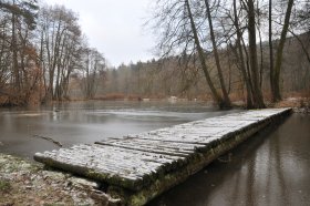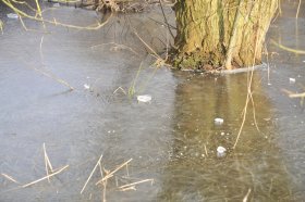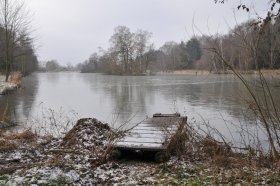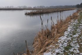 mit vielen Teichen und einer sumpfigen Umgebung, direkt an der früheren Grenze gelegen. Hier zwischen dem vielen Schilf gibt es sehr viele Vögel; Schwäne fliegen und es gibt mehrere Beobachtungsposten und Bildtafeln von Naturschutz und Vogelschutz. Mit der Wanderkarte schaffen wir es, uns auf Wegen und Pfaden zwischen den Teichen durchzuschlagen. Die Umgebung von Obersuhl ist landschaftlich wirklich ein außergewöhnliches Erlebnis. Und diese Wege sind überhaupt nur zu begehen, weil heute der Boden gefroren ist und dadurch hart.