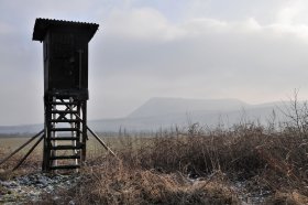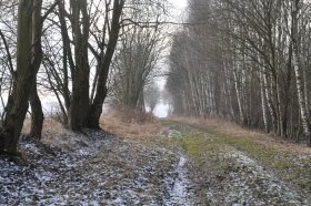der damit 250 m aus der Landschaft ragt und gegenüber der Landkarte schon um einiges gewachsen ist. Das Spiel von Nebel und Sonne ist wirklich spannend. Wir wünschen uns langsam die Sonne; es ist mit bestimmt -3° und etwas Wind schon ziemlich kalt. Wir müssen immer wieder die Finger bewegen, damit die Hände nicht zu kalt werden. Am Ende des Naturschutzgebiets kommen wir wieder an die alte Grenze. Wir können dort jetzt den wahrscheinlich früher auf DDR-Seite zur Beobachtung dienenden Weg