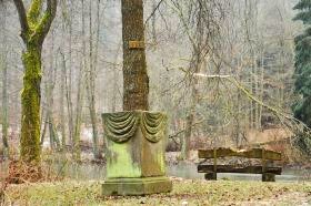 auch noch aus Zeiten der Landgrafen. Vor diesen Obelisk machen wir das Foto mit uns drauf, mit dem wir ein erreichtes Ziel dokumentieren. Es dauert also etwas, bis wir den Teich erreichen, in dem Hermann schwimmen gelernt hat.
