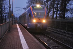 den Kaliberg und gepflügte Felder im Abendlicht. Der Zug ist wirklich pünktlich