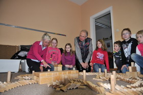 kommen wir in ein Zimmer, wo die Kinder eine Dominolandschaft aufgebaut haben und durch Kippen eines Steins alle Steine, auch durch einen Tunnel,