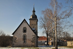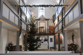 Interessant ist die durchgehende Holzrückwand mit eingebauten Altarbildern hinter dem freistehenden Altar. Das treffen wir später in größer noch in der Bach-Kirche in Arnstadt an.