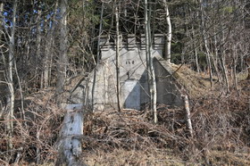 Ein paar Häuser dahinter steigt die Wiese schon steil an. Wir überqueren sie; am Waldrand sehen wir einen zinnengekrönten, vermauerten Eingang von 1907. Wir vermuten: Stolleneingang, es ist aber ein Wasserbehälter.
