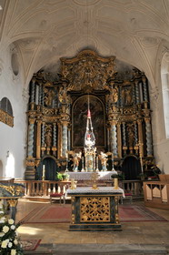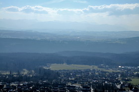 und der geschnitzen Naturholz-Empore strahlt heute in der Sonne viel mehr als gestern. Die Sicht ist besser, die vorgelagerte Alpenreihe mit 2000ern von Heimgarten bis Kreuzspitze und Hochplatte