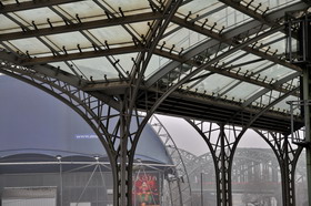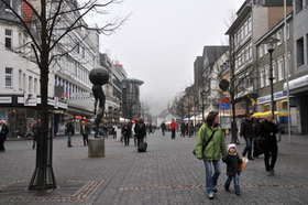Heute starten wir eine Kurz-Rundreise. Waltraud und Christian haben uns ins Bergische Land geschickt, wo wir schon einmal waren, in Ründeroth und Wallefeld. Als ersten Ort nehmen wir uns Lieberhausen bei Gummersbach vor. Die Strecke kennen wir: Köln und durchs Aggertal, diesmal allerdings bis zum Ende in Gummersbach. Die Züge sind auf die Minute pünktlich, dabei hatten wir mit Streiks gerechnet. Einzige Mini-Panne der Bahn: Im letzten Wagen des ICE muten die Reservierungen etwas seltsam an, die Fahrgäste wollen auf die freien Plätze, und die ab Flughafen reservierten bleiben leer. Es klärt sich nachher auf: Die Anzeigen an den Wagenenden zeigen den richtigen Zug, die Displays im Eingangsbereich einen anderen, der schon eine Stunde weiter und in Bochum ist, und der Bordcomputer zeigt die Reservierungen dieses Zuges. Nach Gummersbach fahren wir in modernen Talent-Diesel-Triebwagen. Wir wundern uns, dass unsere Scheibe als einzige beschlagen ist. Bald finden wir die Lösung: In der Doppelscheibe steht Wasser. Wir können sehr schön beobachten, wie der Zug beschleunigt und bremst, sogar Wellen gibt es. Ich beobachte dieses physikalische Experiment ausgiebig, muss mich dann aber doch Marlis’ Wunsch nach besserer Sicht beugen und wir wechseln den Platz. In Ludwigshafen war es schon trübe, im Bergischen Land sitzen wir direkt in den nässenden Wolken. In Gummersbach werfen wir den Blick in die kurze, breite Fußgängerzone, beherrscht von einem Saturn-Markt. Mit dem Bus geht es nach Lieberhausen.