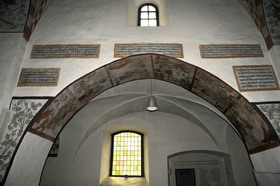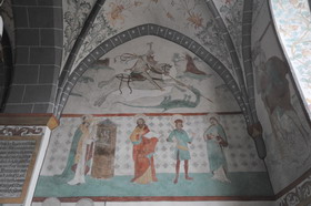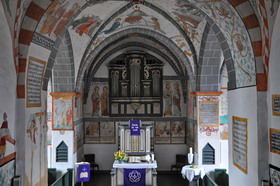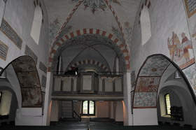Das 300-Seelen-Dorf hat einen Gasthof, in dem übernachten wir. Das Restaurant hat leider heute Ruhetag. Wir haben ein Zimmer mit Himmelbett und Butzenscheiben, gegenüber der Bushaltestelle, direkt am Kirchplatz. Die Kirche wird “Bunte Kerke” genannt, hier haben Waltraud und Christian 1966 ökumenisch geheiratet mit dem Hochzeitsspruch “Du bist der Quell meines Lebens”. Es ist eine kleine dreischiffige romanische Pfeilerbasilika mit den ältesten Teilen von 1100. Im 15. Jahrhundert wurde sie um ein gotsches Querschiff mit Chor erweitert. Das besondere, wenn nicht einmalige ist die fast vollständige Bemalung der Innenwände und Decken mit mittelalterlichen Motiven. Monika Kretschmer erklärt uns alles in einer einstündigen Führung. Die ersten Malereien entstanden um 1480, seit 1586 ist der Ort und die Kirche evangelisch. Welche Bedeutung die Bilder für die Menschen, die überwiegend nicht lesen konnten, damals hatten, wissen wir seit unserem Besuch in Wittenberg genau. Nach der Reformation wurden 1589 die Wandbilder sogar restauriert, ergänzt und Texte eingefügt. 1850 waren sie den Bürgern “zu bunt” und wurden weiß übertüncht. 1911 wurden sie wiederentdeckt, freigelegt und restauriert, 1954 nochmals. Farblich orientierte man sich dabei an dem kunstgeschichtlich wertvollsten Kreuzigungs-Bild aus der ersten Malphase, so dass die Kirche ein schönes geschlossenes Bild abgibt. Themen sind die Apostel, die zehn Gebote, viele Bilder mit Maria und dem Christuskind und Szenen aus dem Leben von Christus und den Heiligen. Alles lässt sich durch die handlichen Ausmaße der Kirche sehr gut betrachten. Die kompakte zentrale Anordnung von Altar, Kanzel und Orgelprospekt im Chor macht sich gut.