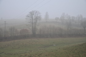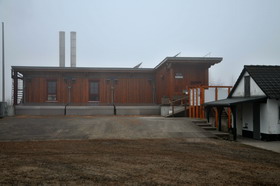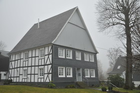 Wir laufen durch den hübschen Ort mit typisch bergischem Fachwerk mit Schiefer. Zweimal bekam er bundesweit Silber im Wettbewerb “Unser Dorf soll schöner werden”. In vielen Gärten wachsen Massen von Schneeglöckchen und Krokusse. Wir haben von einem Heizwerk im Ort gehört und fragen eine Passantin; mit diesen Auskünften finden wir es sogar im Nebel auf dem Berg über dem Ort. Der Heimatverein hat die Anlage initiiert, sie wird mit Holzschnitzeln aus Restholz betrieben und versorgt den ganzen Ort mit Fernwärme. Bei Engpässen kann auch Öl verfeuert werden. 2001 bekam die Anlage einen Umweltpreis von Bärbel Höhn.