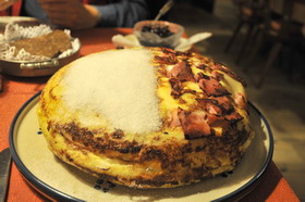 Wir wandern über den Berg zwei Kilometer nach Niederrengse, dort ist das nächste Gasthaus. Die Wanderkarte ist mal wieder ein Handyfoto der Infotafel des Ortes. Die Landschaft ist sehr bergig, einzelne Stellen könnten auch in den niederen Alpen sein. Alles ist feucht und viel weiter zurück als in Ludwigshafen. Die Rengser Mühle ist nicht ganz unser Stil, die Betonung von Edelsteinen und Lebendigem Wasser finden wir etwas übertrieben, die Preise gehoben. Wir starten mit einer leckeren und heißen Sellerierahmsuppe mit Trüffel. Es folgt die lokale Spezialität, ein 15 cm hoher Eierkuchen für zwei. Er ist mit ungesüßtem Eischnee gefüllt, und unsere Variante halb mit Speck, halb mit Zucker belegt. Dazu wählen wir Schwarzbrot mit Butter und Preiselbeeren. Wir sind nach diesem besonderen Erlebnis pappsatt, es öfter zu essen wäre allerdings gewöhnungsbedürftig. Der Rückweg durch den Wald und der selten befahrenen Straße klappt bestens im Dunkeln dank der Stirnlampe, die wir immer mithaben. Da wir uns vom Hinweg schon auskennen, kommt uns der Rückweg kurz vor. Marlis ist müde vom frühen Aufstehen und schläft, ich habe Ruhe zum Tippen.