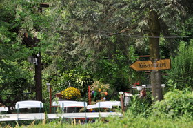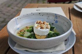Gegenüber der Straße kann man seiner kleinen Enten- und Gänsehaltung zusehen und den Kräutergarten bewundern. Landwirtschaft und Gastronomie sind Bioland-zertifiziert. Alle Grundprodukte stammen aus Eigenproduktion oder von namentlich genannten, fast ausschließlich regionalen Erzeugern. Seine Gerichte leben vom Eigengeschmack und der Kombination der Bestandteile, was ich sehr liebe und viel Genuss mit wenig Menge erlaubt. Der Einsatz von Sahne, Mehl, Fett, Öl und Essig ist sehr sparsam, frische Kräuter werden oft verwendet, von Tieren werden soweit es geht alle Teile verwertet. Entsprechend wechselt die Speisekarte laufend, ich liebe diese vielen Entdeckungsmöglichkeiten. Bei dieser konsequenten Philosophie, die sicher auch Verzicht auf Umsatzmöglichkeiten bedeutet und das Wirtschaften schwieriger, aber auch befriedigender macht, wird das Hofgut natürlich auch im Genussführer von Slowfood Pfalz geführt.