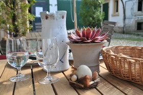 präsentieren ihren Frühling. Im malerischen Hofgut, einem alten Gebäude des bekannten Deidesheimer Weinguts Bürklin-Wolf, das jetzt verpachtet ist, betreibt Jean-Philippe Aiguier seine eigenwillige Gastronomie. Es geht alles etwas ruhiger zu, die Hühner laufen im romantischen Hof zwischen den Beinen