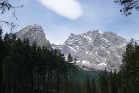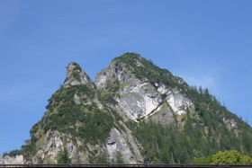 dort bereiten sich Kletterer für den Einstieg vor, auch im Fels hängend entdecken wir einige. Schöne Pflanzen begleiten uns, leider ist die Sicht immer durch Bäume verdeckt. Das ändert sich erst bei Annäherung an die Kührointalm, wo der Weg zum teilweise steinigen Pfad wird. Direkt vor uns steht der kleine Watzmann,