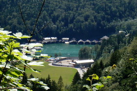 über die Kührointalm zum Watzmannhaus aufbrechen. Über 1300 m Aufstieg liegen vor uns, etwas mehr haben wir nur einmal, vor über zehn Jahren mit Marlis’ Sohn, der diesmal der Ideengeber ist, auf die Zugspitze geschafft. Eigentlich schickt uns Lars auf die Zugspitze, aber mit dem Zusatz, dass er eigentlich an den Watzmann denkt, ihn aber zu anstrengend für uns hält. Wir finden aber diesen heimlichen Wunsch interessanter. Vorgestern haben wir ja schon trainiert. Heute fühlen wir uns fit, die Sonne scheint, alle Berge sind wolkenfrei. Durch Wald geht es entlang der großen Bobbahn Königssee,