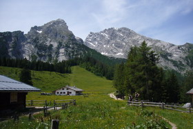 dahinter der Watzmann-Hauptkamm, grandios: grau, einzelne Schneeflecken. Bis ca. 1500 m Höhe gibt es noch Bäume, die die Sicht behindern, bis 1800 m Wiesen und niedrigere Büsche, darüber nur noch kleine Wiesenstücke mit Alpenblumen. Wir kehren in der Alm