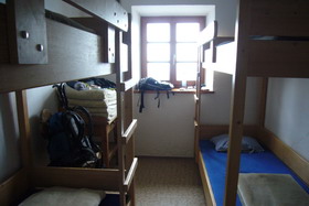 ist um 16 Uhr schon leer, nur einzelne Übernachtungsgäste sind da, die Einkehrer sind uns alle entgegengekommen. Wir checken ein und kaufen uns die Hüttenschlafsäcke; gestellt werden Kissen und Decken. In den Zimmern gibt es keine Heizung, wir haben ein Zimmer mit zwei Stockbetten