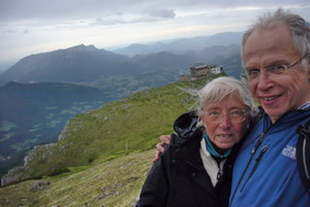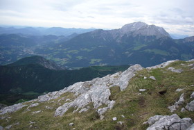 gelangen. Das ist der schwierigste, spannendste und schönste Teil, manchmal gehts fast senkrecht runter, problematisch ist es aber nicht. Toll ist, dass alle Kämme frei zu sehen sind, alle Wolken sind höher, und es gibt noch blaue Flecken und keinen nennenswerten Wind. Auf dem Hauptkamm haben wir fast immer das Watzmannhaus auf seiner kleinen Spitze, den kleinen Watzmann und alle umliegenden Berge im Blick, und je höher wir kommen, auch die Berge dahinter und das bayrische Alpenvorland, dazu natürlich das über 1300 Meter tiefere Berchtesgaden. Unterwegs begegnen wir einer Biologie-Doktorandin,