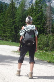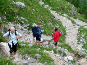 tragen konnte und so jeder seine eigene Kleidung im Griff hat. Das eröffnet uns für Mehrtagestouren ganz andere Möglichkeiten; meine Gelenke kommen nicht so schnell an die Belastungsgrenze, und für mich reicht vom Volumen her der handliche Reiserucksack. Beide Rucksäcke sind, was wir als wichtig empfinden, mit allem Tragekomfort ausgestattet: steifer, belüfteter Rücken, gute, auch oben verstellbare Tragegurte, Hüft- und Brustgurt, und eine oben nicht schlanke, gut anliegende Form. Zum Glück haben wir den großen Fotoapparat nicht mitgenommen, das Gebaumel hätte Marlis die Laune verdorben, schließlich will sie ihn ja griffbereit haben, im Rucksack nutzt er nichts. Die Vorbereitungstour vorgestern hat sich offensichtlich gelohnt, der Aufstieg ist optimal gelaufen, kein Gelenk hat sich gemeldet. Die Hütte