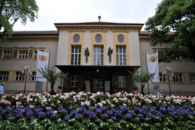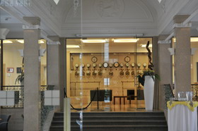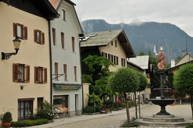 Als wir aufstehen, ist es bedeckt, und die Wolken hängen auf 1300m, verdecken also alle umliegenden Berge. Da haben wir die letzten Tage echt Glück gehabt mit der tollen Sicht, und heute kommen wir wenigstens regenfrei durch. Wir nehmen uns endlich Bad Reichenhall vor, bevor wir am Nachmittag zurückfahren. Die Stadt mit ca. 15000 Einwohnern teilt sich in drei Bereiche: der schmale Streifen östlich der Bahn mit Altstadt und Kureinrichtungen; zwischen Bahn und Umgehungsstraße am Fluss Saalach stehen Krankenhaus, Therme und viele Gästehäuser, und als drittes die Viertel westlich der Saalach mit der Bahn zum Predigtstuhl, der mit dem Staufenmassiv die Stadt umrahmt und über 1000 Meter überragt. Wir orientieren uns am Rundgangprospekt der Touristenverwaltung. Kurgarten und Gradierwerk haben wir schon gesehen, das königliche Kurhaus ist ein neobarockes Veranstaltungshaus, das Kurmittelhaus der Moderne