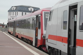 Sylt und Föhr, auf der anderen Seite begleiten uns lange die Warften auf Hooge und Langeness. In Dagebüll steht die witzige Kurswagenzusammenstellung