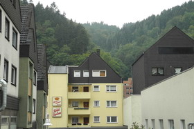 und kommen auf die Brücke über die Lenne und die Bahn mit nochmals bester Sicht hoch auf die Burg. Gegenüber vom Bahnhof ist eine bekannte Konditorei, die heute offen hat, wir decken uns mit Torte ein und nehmen dann den Zug nach Hagen, wo wir nach Bestwig umsteigen. Hier reicht es für genau zwei Stunden Unterbrechung: Etwa zwei Kilometer nördlich, auf der anderen Seite der Ruhr den Hang hoch, liegt Föckinghausen, ein Dörfchen mit wenigen Häusern, wo ich in meiner Essener Zeit, also vor 1965, ein- oder zweimal als Schüler in Ferien war. Das Bild des U-förmigen, dunkelbraunen, einstöckigen Holzbaues habe ich heute noch im Kopf, wohl weil mir eine Postkarte vor Augen schwebt, die es in einem meiner alten Alben geben müsste. Im Internet ist mir ein Caritasheim begegnet, kurz vor Ankunft in Google Maps noch ein Schullandheim. Die Wege in den Karten von Google Maps und Nokia sind recht umständlich; auf denen haben wir in der Zeit zu Fuß keine Chance. Also Augen auf nach Plänen am Bahnhof: Da hängt ein Stadtplan, da sieht man zwei nahe Brückchen über die Ruhr, das fotografiere ich ab, da entlang wäre die Entfernung machbar. Ein Taxi ist vor dem Bahnhof auch nicht zu sehen, hier hätten wir das gemacht. Das Gepäck werden wir in der Bahnhofsbäckerei los, die junge Dame hilft uns gerne, wir dürfen es auch noch in ihrer Aufräumzeit abholen, bestens. Also laufen wir los, wir sehen keinen Weg und folgen zwei Minuten einer Straße, die nicht ganz passt, da kommt uns ein Paar mit Kinderwagen entgegen, die fragen wir und bekommen kompetente Antwort: hinter uns am Bahnübergang