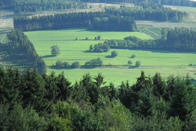 führt. Wir gehen sehr schnell und schwitzen, wir wollen auf dem Hinweg keine vermeidbare Zeit verlieren, damit wir nicht unverrichteter Dinge abbrechen müssen. Nach genau 30 Minuten strammer Wanderung – ich ermittle hinterher 2,5 km und 170m Steigung, eine für uns stramme Leistung – kommen wir genau am westlichen Dorfrand aus dem Wald, und da liegt er,