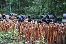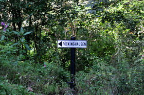 den Aufstiegsbeginn und ein Wanderzeichen mit Ziel Föckinghausen. Nach kurzer Zeit stimmt die fotografierte Karte nicht mehr, eine Baustraße zur Autobahnbaustelle durchschneidet alles, das Wanderzeichen können wir zum Glück verfolgen, nach kurzem Weg auf der Straße biegt es in einen Feldweg, der genau in die richtige Richtung steil bergauf
