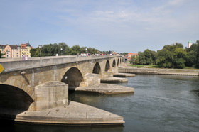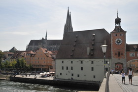 passenden Raum. Gegen Mittag laufen wir los, ich habe von einem früheren Kurzbesuch eine grobe Idee der Stadt. Zwischendurch schauen wir Schaufenster an, es gibt originelle Geschäfte, wenn auch nichts, was wir unbedingt haben wollen, die Ziele für Montag lassen also auf sich warten. Bei dem heute noch schönen Wetter gehts gleich zur Steiernen Brücke, das Muss in Regensburg. Die Donaubrücke aus dem 12. Jahrhundert war damals die Brücke schlechthin, ein technisches Wunderwerk, und das Vorbild für die Prager Karlsbrücke 200 Jahre später. Sicher ist sie auch ein wesentlicher Aspekt für den Weltkulturerbe-Status seit 2006. Dazu passend gibt es im alten rechten Brückenhaus eine Ausstellung in historischem Ambiente mit groben Balkendecken und -stützen mit allen Hintergründen in modernster Präsentation. Das ist auch wichtig; die Stadtprospekte sind unvollständig, uneinheitlich und nicht immer richtig, da gibt es bessere Beispiele. Eine Stadt mit der Wirtschaftskraft und den Tourismusmassen sollte mehr hinbekommen. Zu Füßen des Gebäudes an der Donau liegt die “Wurstkuchl”,