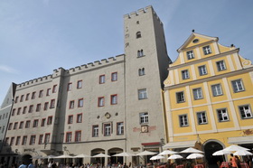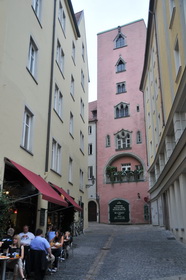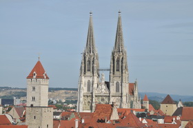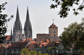 mit erneutem Altstadtblick. Durch stille Altstadtgassen im Westen kommen wir zum Stadttheater, hier beginnt die belebte Zone mit Kneipen, Läden, Sehenswürdigkeiten und geschlossenem Altstadtbild. Regensburg kommt zugute, dass es hier nie Brände oder Zerstörungen gab, daher gibt es sogar noch Reste aus der Römerzeit. Die Stadt war immer weltlich orientiert, auf Handel ausgerichtet und früh protestantisch; hier wurden Kaiser gekrönt, und von 1663 bis 1806 tagte hier der immerwährende Reichstag, dessen Entscheidungen der Kaiser nicht übergehen konnte. Nach Besuch am alten Rathaus steigen wir auf den einzigen Aussichtsturm der Stadt, den der Dreieinigkeitskirche, immerhin hoch genug, um über die Dächer zu schauen