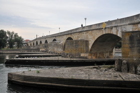 auf der anderen Seite liegt der zum Erbe gehörende Stadtteil Stadtamhof, früher sicher Auslagerungsbereich für Spital und ähnliches, vielleicht auch Wohngebiete, heute eine Insel durch den nördlich verlaufenden Schleusenkanal, der für die Schiffbarkeit der Donau über Regensburg hinaus und den Main-Donau-Kanal nötig war. Wir gehen zurück über die Donauinseln und den Eisernen Steg von 1901