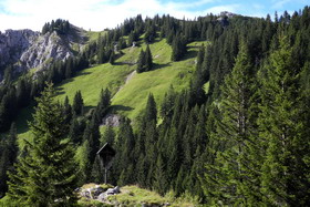 öffnet, auf Richtung Pürschling. Kurz vor dem Gipfelkamm endet der Wald,