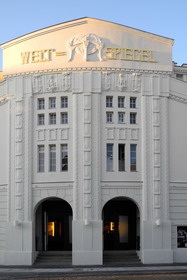 im ehemaligen Dieselkraftwerk, einem hallenartigen, imposanten Backsteinbau, der mit moderner Museumsarchitektur konkurrieren kann. Gelesen habe ich vom Filmtheater Weltspiegel, einem Jugendstilbau, der auf dem Weg zum Bahnhof liegt. Wir steuern passend durch Nebenstraßen, und treffen auf ein beeindruckendes Gebäude
