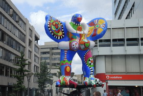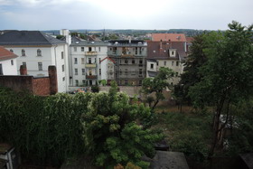 Gestern abend wars ohne Klima ziemlich warm im Zimmer, mit offenem Fenster ruhig nach hinten und dem Standventilator bekommen wir das gut in den Griff, morgens ist es angenehm. Wir schlafen solange es das Frühstück hergibt, besser gesagt Marlis, ich entwickle eine Idee für den Rest des Urlaubs: Chemnitz, Bamberg, Nördlingen, dann schon geplante Ziele. Vor der Abfahrt machen noch einen Stadtbummel. 2008 waren wir das letzte Mal am Ende einer Ruhrgebiets-Radtour hier. Nicht alle Geschäfte finden wir wieder, dafür eine neue Einkaufspassage, die Königspassage. Wir decken uns mit Kirschen, Wasser, Gebäck und einem Piccolo ein, die Fahrt ab 14:04 nach Weimar dauert 6 Stunden, wir haben die direkteste, aber kleinste Verbindung ausgewählt: Dortmund – Soest – Paderborn – Altenbeken – Kassel – Heiligenstadt – Bad Langensalza – Erfurt. Zuerst ein IC, bis Paderborn die platte Soester Börde mit Ackerbau, dann das hügelig-waldige Eggegebirge. Malerisch ist die kleine, teilweise eingleisige Strecke durchs Eichsfeld. Der kleine moderne, aber nicht klimatisierte Triebwagen der Erfurter Bahn ohne 1. Klasse ist in Kassel ganz voll, beinahe wären wir zugunsten der ICE’s nicht eingestiegen, im letzten Moment sagt mir Marlis‘ iphone – mein Handy ist wohl endgültig kaputt – dass alle ICE’s etwas Verspätung bekommen, was mir schlechter kalkulierbar erscheint. Der Zug leert sich auch flott, so dass wir bald gut Platz haben.